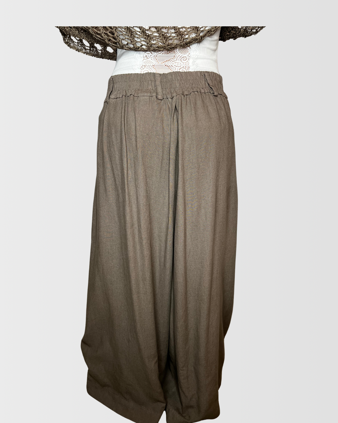 Unisce la silhouette di una gonna alla praticità di un pantalone, perfetta per un look d’avanguardia che non rinuncia alla freschezza del lino.