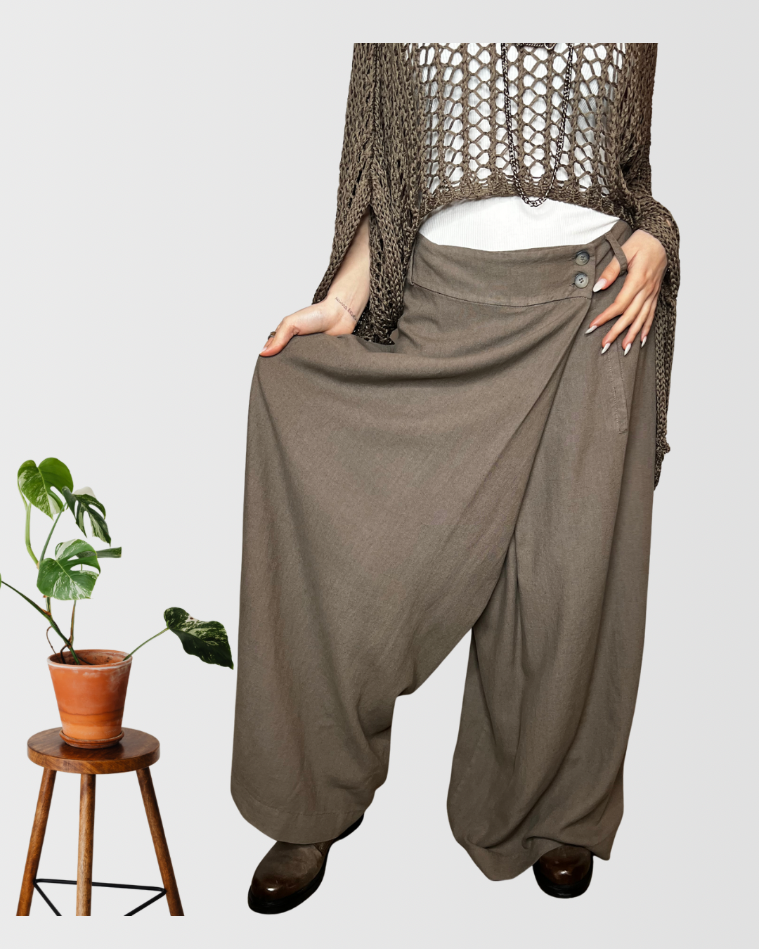 Elegante pantagonna dal taglio ampio e fluido, caratterizzata da un raffinato design a portafoglio con chiusura laterale a bottoni.